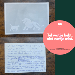 Zo gebruikte ik één van de kaarten in het boek om daar positieve affirmaties op te schrijven. (Opdracht in het boek, Chapter || Overtuigingen & Zelfbeeld). Een van de affirmaties die voor mij heel erg hielp was: “Elke dag heeft iets moois, leg het vast”.